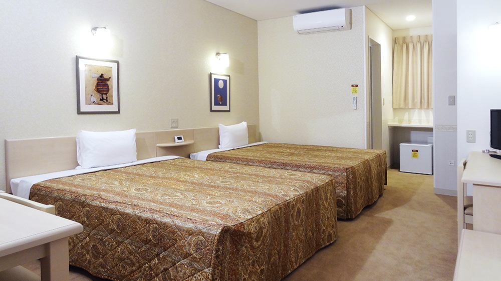 全室にクイーンサイズベッドを2台設置しております。ひとつのベッドが幅154cmでダブルベッドより一回り大きいサイズですので、それぞれに2名は十分お休みいただけます。したがって、1名からご家族4~6人まで1室でお泊りいただけますが、ご希望により、エキストラベッド(シングルサイズ)をご用意させていただきます(1台2,200円/1泊)。