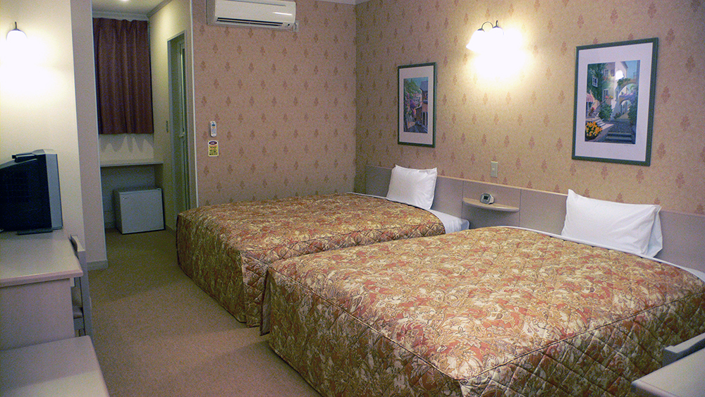 全室にクイーンサイズベッドを2台設置しております。ひとつのベッドが幅154cmでダブルベッドより一回り大きいサイズですので、それぞれに2名は十分お休みいただけます。したがって、1名からご家族4~6人まで1室でお泊りいただけますが、ご希望により、エキストラベッド(シングルサイズ)をご用意させていただきます(1台2,200円/1泊)。