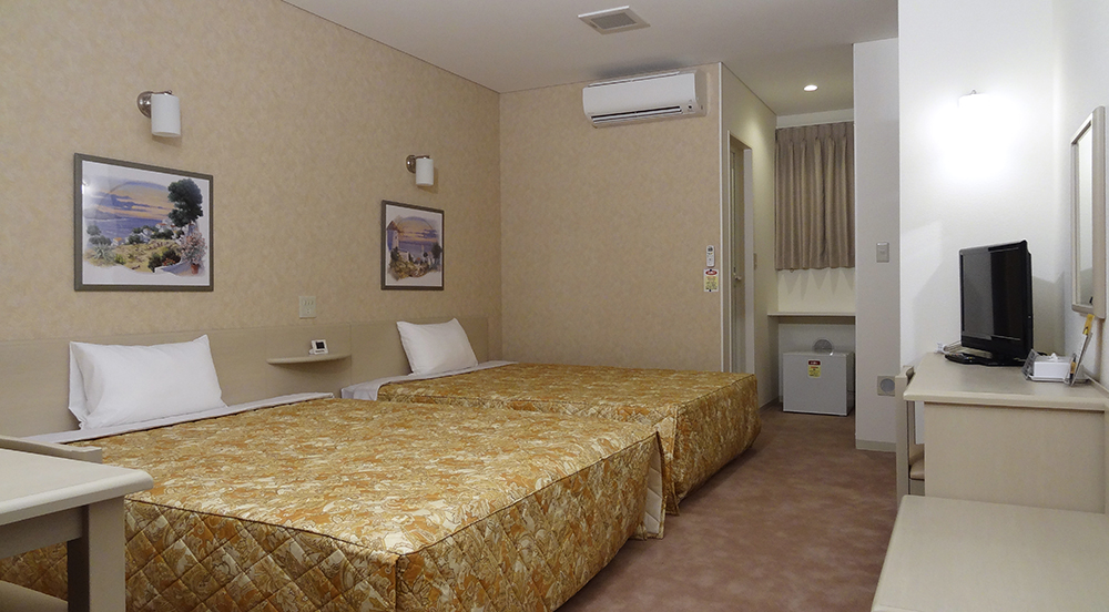 全室にクイーンサイズベッドを2台設置しております。ひとつのベッドが幅154cmでダブルベッドより一回り大きいサイズですので、それぞれに2名は十分お休みいただけます。したがって、1名からご家族4~6人まで1室でお泊りいただけますが、ご希望により、エキストラベッド(シングルサイズ)をご用意させていただきます(1台2,200円/1泊)。