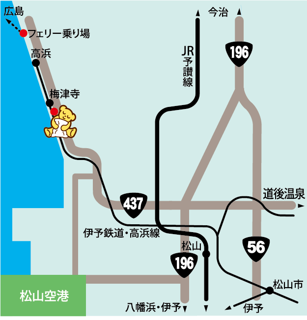 市内から国道196号線・437号線を経て県道19号線を北へ。市中心部の伊予鉄道・松山市駅より9km。