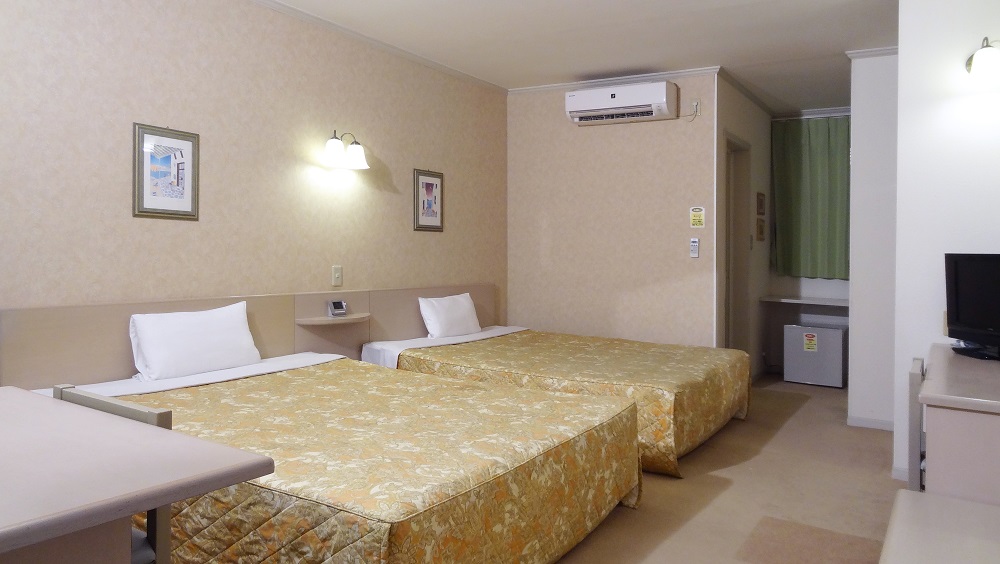 全室にクイーンサイズベッドを2台設置しております。ひとつのベッドが幅154cmでダブルベッドより一回り大きいサイズですので、それぞれに2名は十分お休みいただけます。したがって、1名からご家族4~6人まで1室でお泊りいただけますが、ご希望により、エキストラベッド(シングルサイズ)をご用意させていただきます(1台2,200円/1泊)。