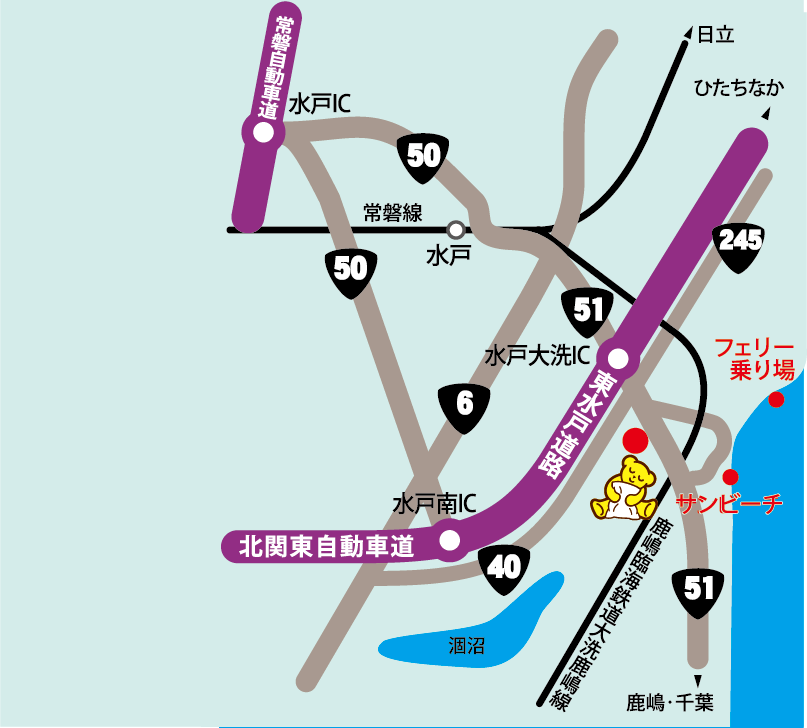 常磐自動車道の友部ジャンクションから北関東自動車道に入り、その終点から接続する東水戸道路の水戸大洗インター下車、国道51号線を鹿嶋方面へ約1.5km右側。