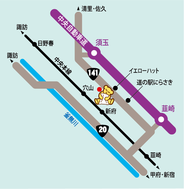 中央自動車道「韮崎IC」「須玉IC」の中間、国道141号沿い。
