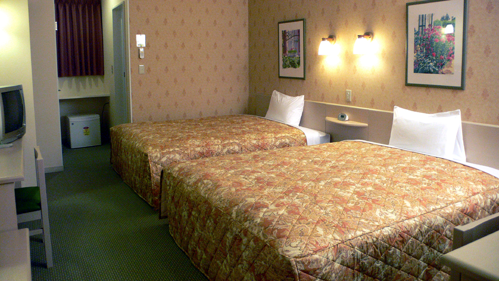 全室にクイーンサイズベッドを2台設置しております。ひとつのベッドが幅154cmでダブルベッドより一回り大きいサイズですので、それぞれに2名は十分お休みいただけます。したがって、1名からご家族4~6人まで1室でお泊りいただけますが、ご希望により、エキストラベッド(シングルサイズ)をご用意させていただきます(1台2,200円/1泊)。