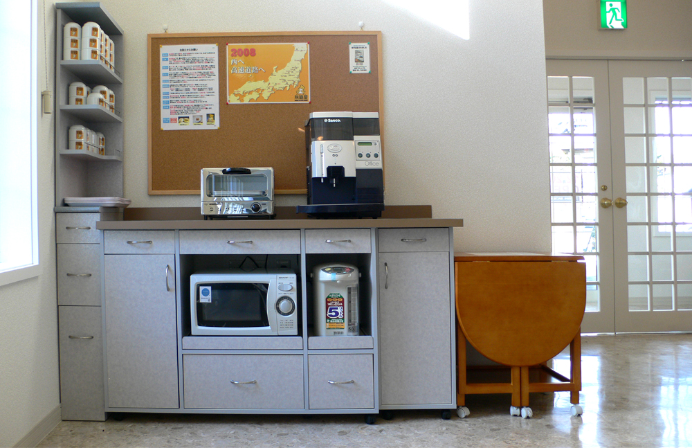 ラウンジに電子レンジ、ポット、トースターをご用意しています。フロントの営業中は、ご自由にご利用ください。