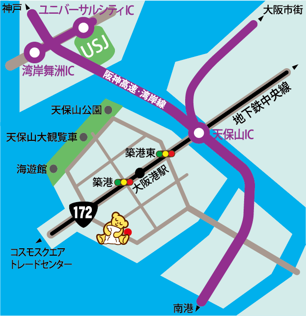 阪神高速・湾岸線の天保山ICから国道172号線を西へ。500m進んだ築港交差点を左折し、突き当りを右折。