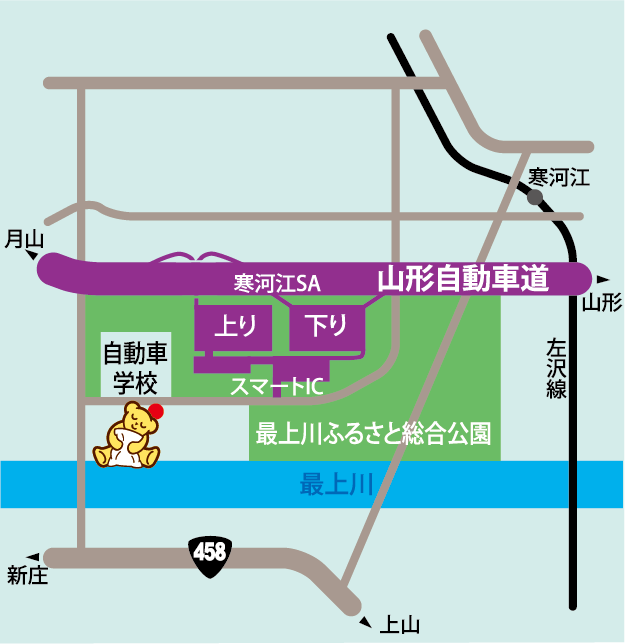 前は寒河江SA、後ろは最上川河畔、スマートICの出口そばです。