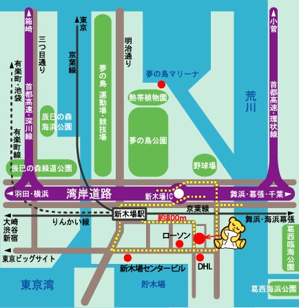新木場駅(JR京葉線・東京臨海高速鉄道・地下鉄有楽町線)より約800m、徒歩で約10~15分。