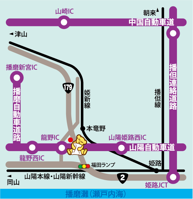 山陽道・龍野ICから約1.1km、国道179号線沿い。本竜野駅から約600m。