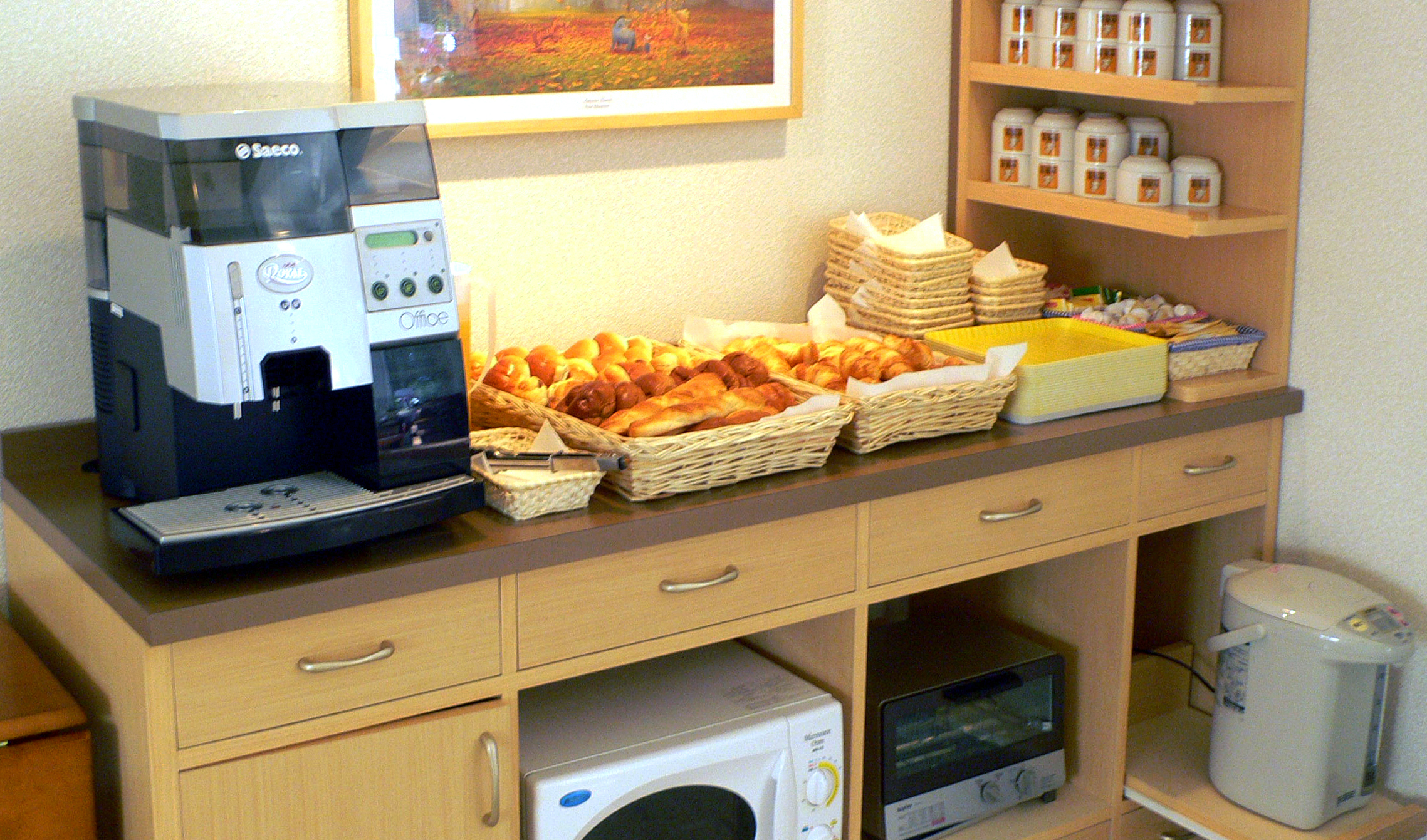ビュッフェのようにあれもこれものサービスはありませんが、朝、空腹で旅立たなくてもよいように、心ばかりのパンと飲み物を無料で提供しています。