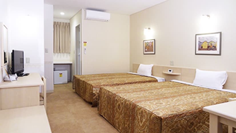 部屋は25㎡あり、一般的なビジネスホテルのシングルルームの約2倍の広さです。幅154cmの大きなサイズのベッドが2台。お子様と添い寝ができます。さらにバゲッジラック、テーブル、デスク、クローゼット等の家具を余裕をもって配置しており、広めの空間でゆったりとおくつろぎいただけます。