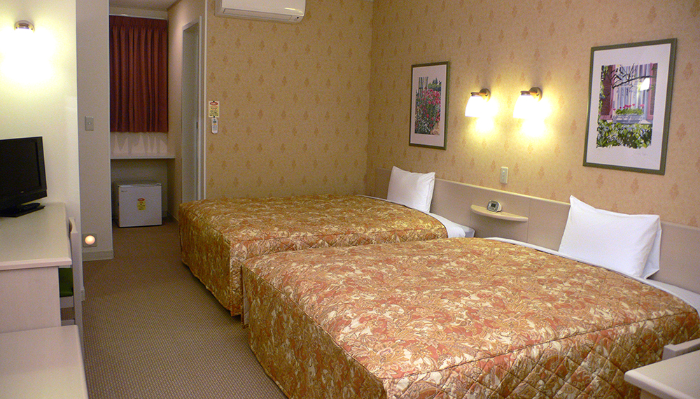 約25㎡。幅1.5m超のクイーンサイズベッドが2台。